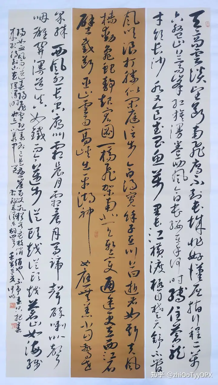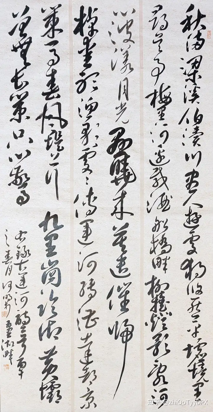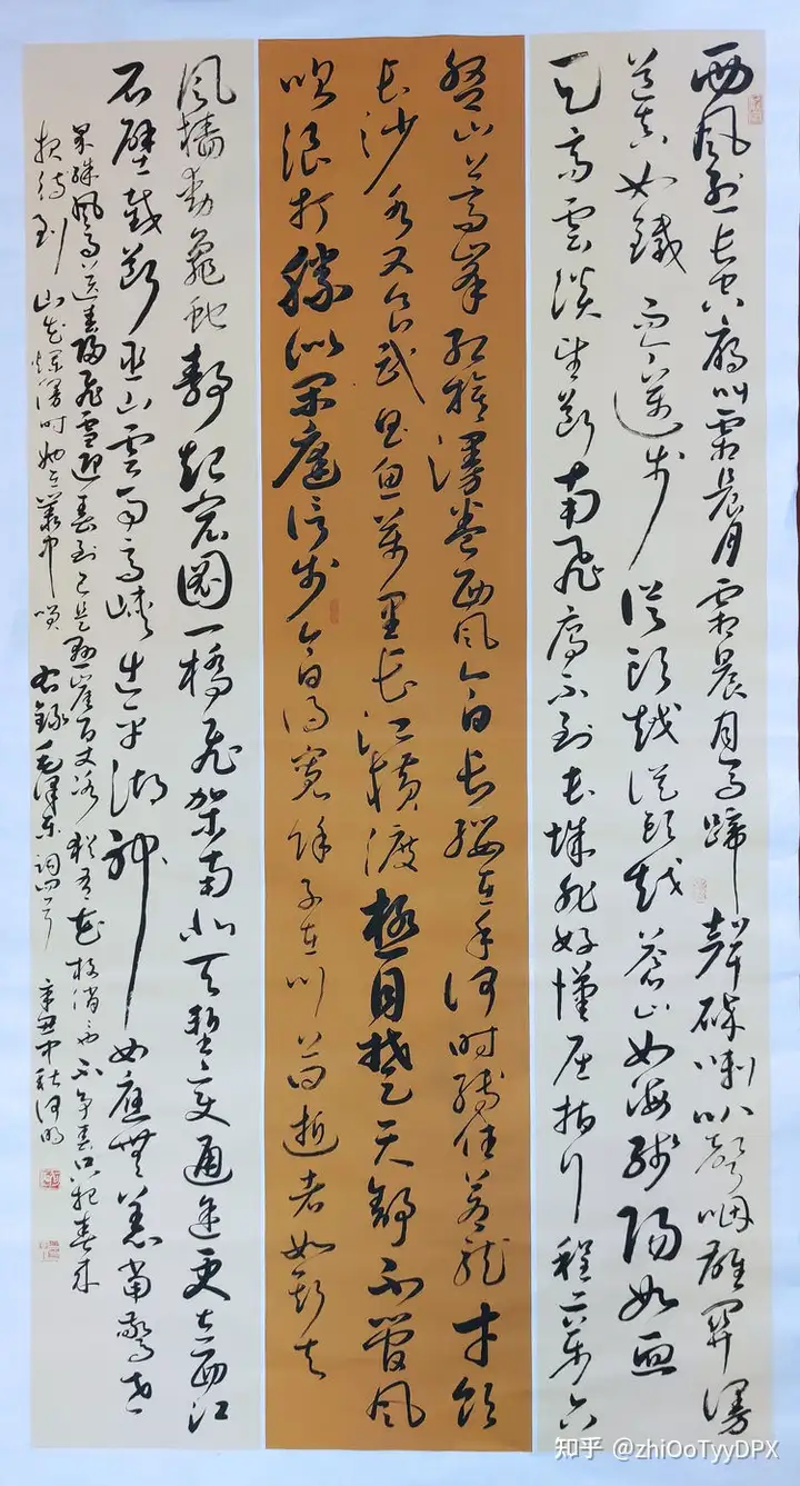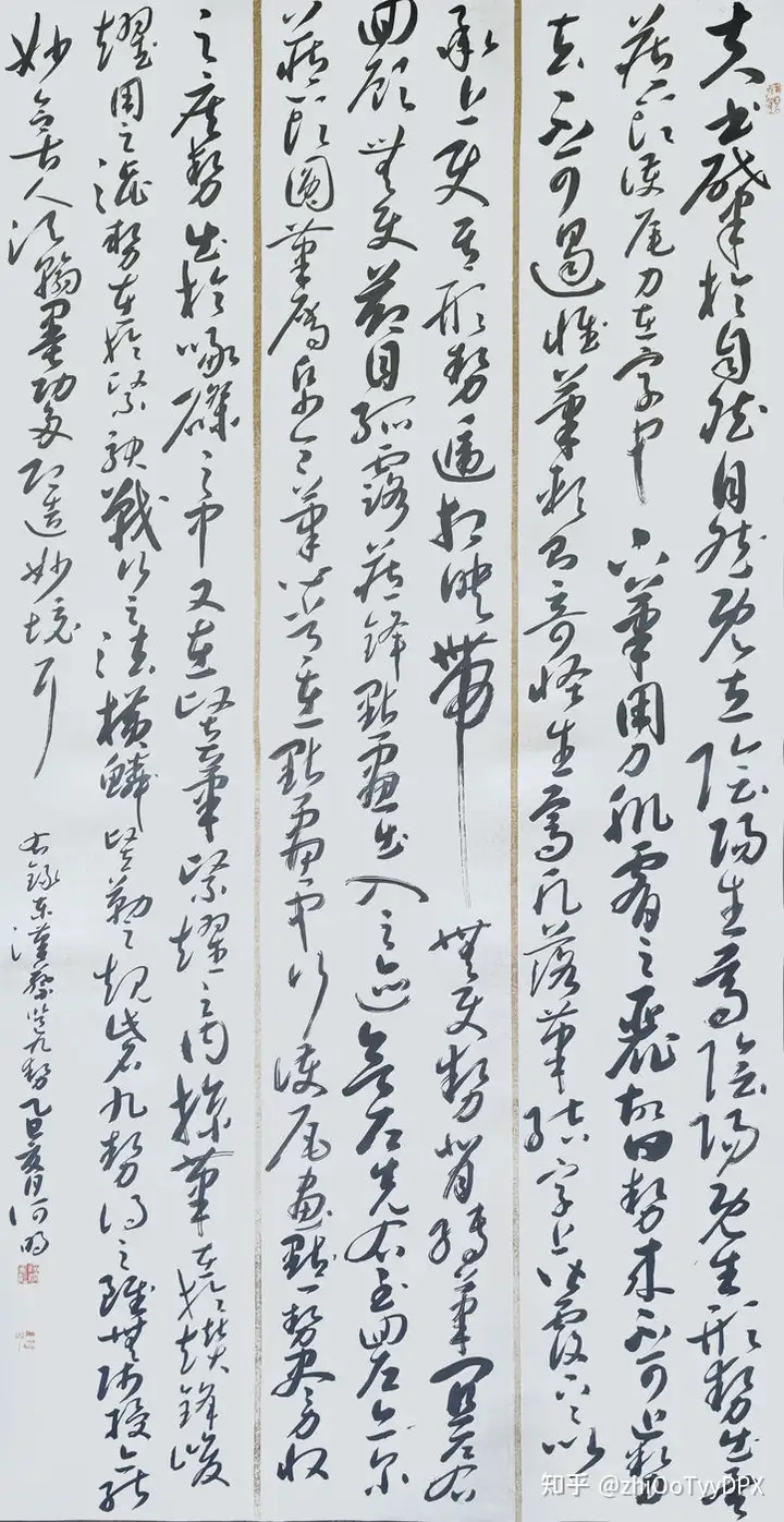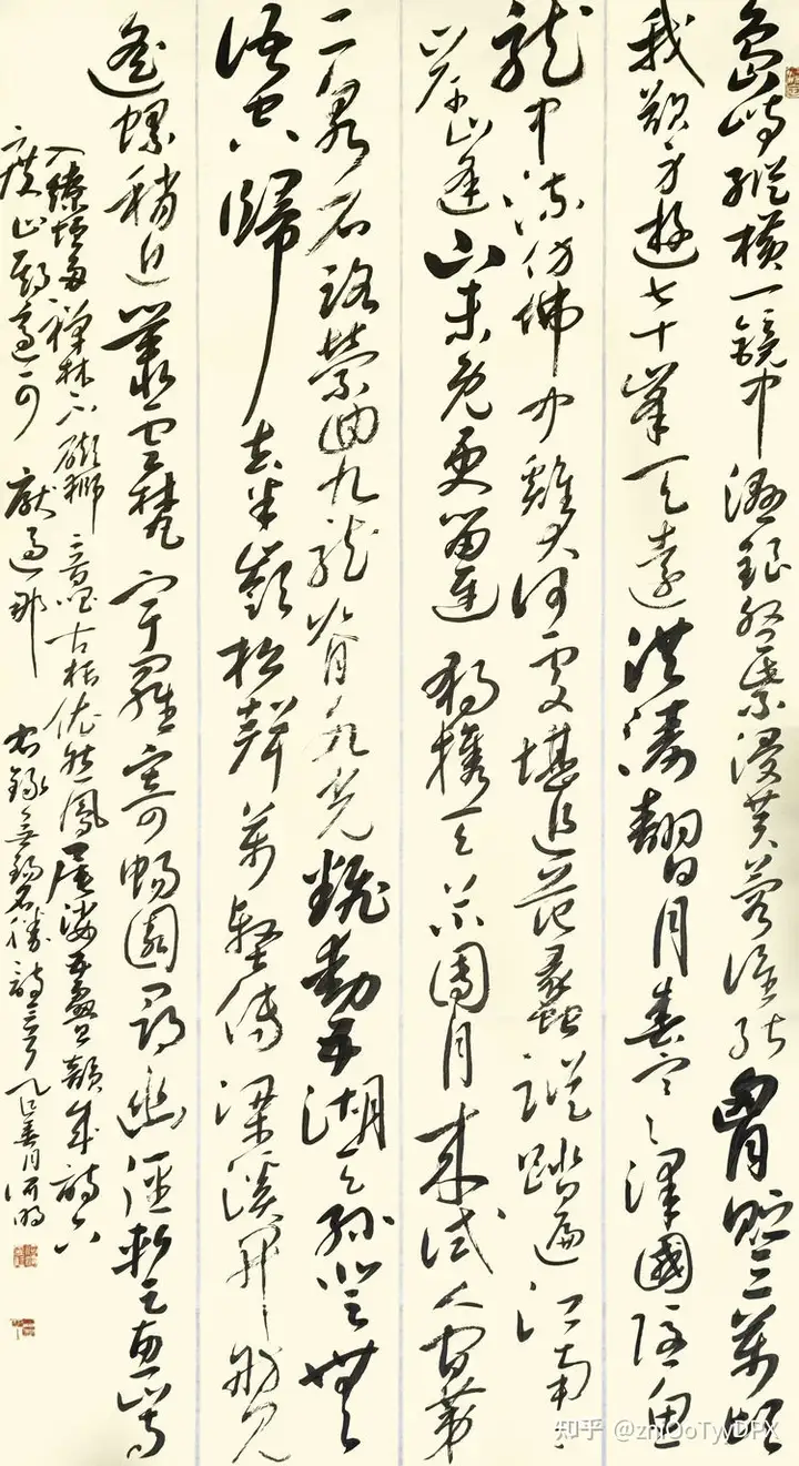 他格外注重书法作品的内在韵味与艺术质感,力求每一幅作品都耐人寻味、意境悠远。在创作中,他精准把控笔法、结构、墨色、章法的多变技巧,巧妙拿捏传统与创新、刚与柔、虚与实、快与慢、浓与淡等诸多对立又统一的关系,让笔墨变化万千、层次丰富,将书法艺术之美展现得淋漓尽致。其行草书作品,以晋代文人法帖为根基,兼具《兰亭序》的万千变化、米芾的秀丽清逸、《伯远帖》的天质自然,又吸纳怀素草书之瘦劲、张旭草书之丰腴,执笔运笔间,锋杪起伏多变,毫芒衄挫精妙,将笔墨的速度与力度完美融合,洒脱自如、气韵生动,全无江湖书体的粗糙随意,也无展览体的刻意造作,尽显文人书法的自然真趣。